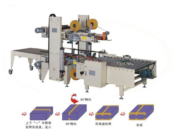 • 標題: 四角邊全自動封箱機 簡單說明: 本套系列是以單機組合配套,單機型四角邊封箱系列??膳浜掀渌?ldquo;一”字型貼帶機型聯(lián)機型聯(lián)機配套,組合成(工字型自動封箱)作業(yè)。 傳動設計方式,采上下傳動送箱貼帶封箱包裝作業(yè)。 適用紙箱規(guī)格內(nèi),于同一個時間內(nèi)包裝單規(guī)格化之不同一紙箱,全自動調(diào)整型。 聯(lián)機流程采十字型九十度轉(zhuǎn)向機配合聯(lián)機,以直線式流程工字型封箱包裝使用。 型號 ZT-500J標準單機型(單位:MM) 使用電源 220V/380V、1∮~3∮、50/60HZ(其它可指定配置) 適用紙箱 320~500Lx250~500Wx180~500H(較小、較大箱尺寸,另協(xié)定) 使用氣源 6KG、f/cm2-150nl/min 臺面高度 最小500MM、最大750MMH(其它高度可指定配制) 適用膠帶 48mmW~60~75mmWx1000碼L(可指定配置) 封箱速度 每小時360~400箱(需更快、可另協(xié)定) 機械重量 淨重350Kg 機械尺寸 1300Lx1000Wx1400H 機械重量 淨重350Kg 毛重480kgs(含木箱總重量) ★以上規(guī)格爲標準機型適用,如有更大尺寸600P型、700P型、800P型、900P型、1000型之長寬高,另有加大機型提供,皆可訂作。