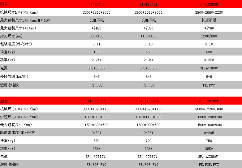 ZT-11045M + ZT-11060 PE automatic cuff packing machine is designed for single object or paper carrier. This machine can be connected with the production line for automatic feeding, film wrapping, sealing, contraction and cooling. It can introduce Advanced International technology and technology to the operation of unpersonalised water flow. The speed of the feed belt is adjusted by the Mitsubishi PLC Programmable Controller. The machine, electricity and gas are integrated by a specially designed three-piece sealing knife. The sealing line is strong, uncracking, and the feed belt is not easy to stick. Let the furnace chamber hot air spread evenly, the effect is more beautiful after contraction transmission using frequency converter control transmission speed.Make the whole operation of the machine really high-speed, unmanned automatic operation. According to different products, we can choose various types of automatic feed system T-5025 high speed hot air cycle condenser using roller belt, cylinder outsourcing high temperature resistant silicone tube, each can rotate freely, or choose Tefron mesh conveyor belt or stainless steel conveyor net. With transparent window function, the whole process of packing can be seen that the temperature is uniform in the furnace. It can be used to shrink PVC, POF and other different materials in the shrink film furnace to form the heat circulation. According to the packing needs of different packages, the speed and slowness of the conveyor belt are adjusted to achieve the best shrinkage effect.